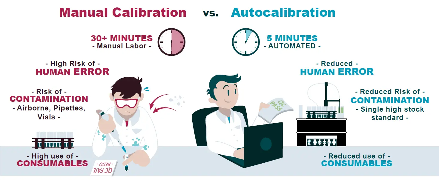 Autocalibration improves laboratory efficiency by eliminating the need for labor-intensive and error prone standard preparation. It reduces laboratory waste by reducing calibration vial, reagent, and standard waste. prepFAST autocalibration is particularly important for low concentration standards near the detection limit.