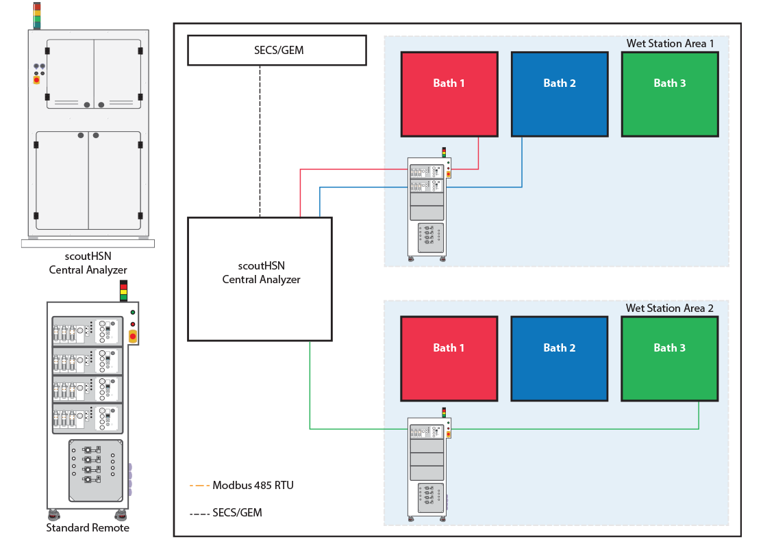 The scoutHSN is an online monitoring system that allows fully automated unattended measurement of ppm level free silicon and simultaneous monitoring of bound silicon. A single scoutHSN is capable of monitoring free and bound silicon in hot phosphoric baths.